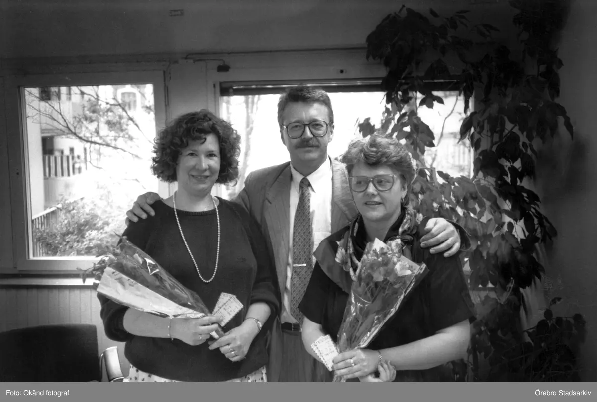 Två vinnare av Frank Sinatra-biljetter grattas av Kommundatas regionchef, 1990