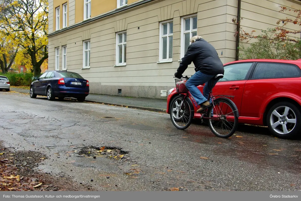 Cyklist passerar potthål i gatan vid Venavägen 21, 2010-10-26