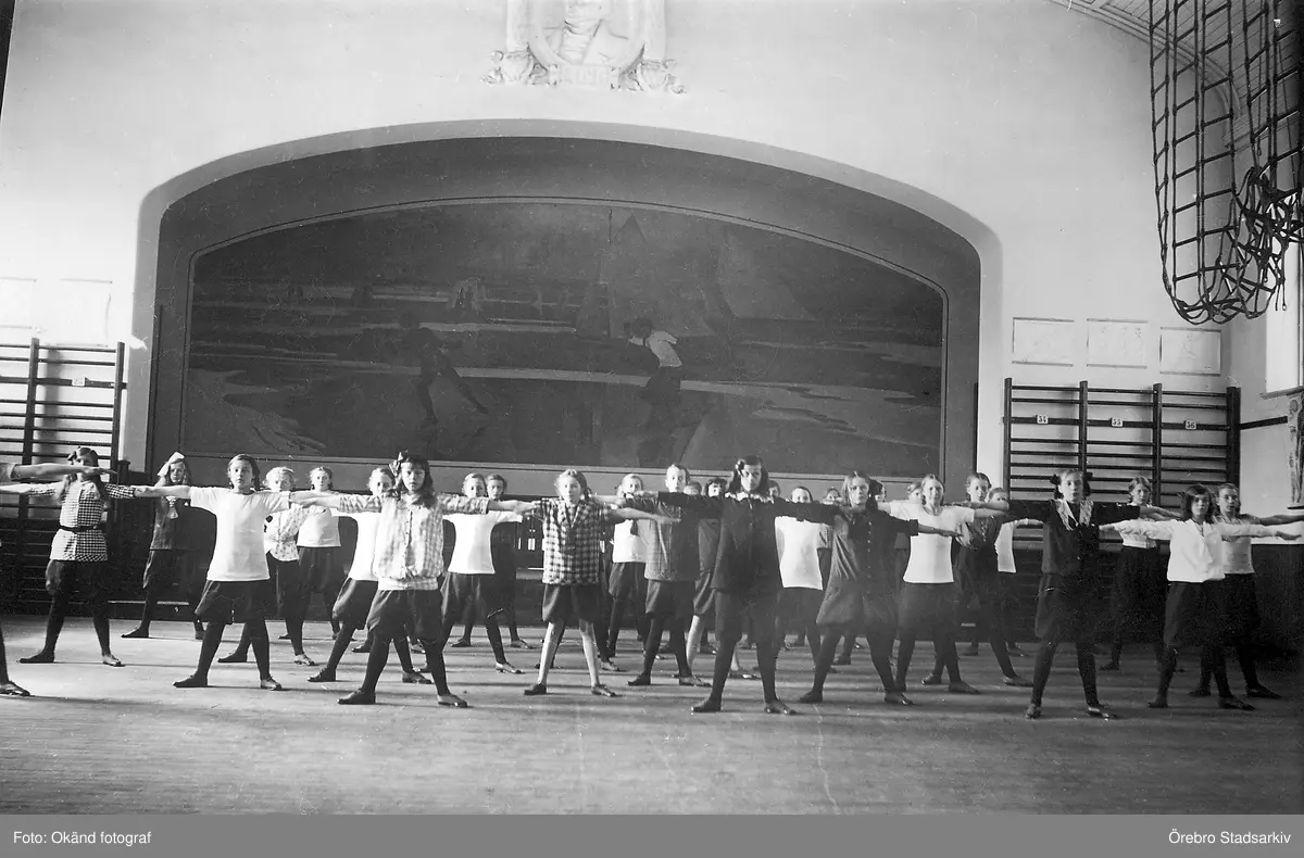 Gymnastiklektion för Risbergska skolans elever i Karolinska skolans gymnastiksal, 1920-tal