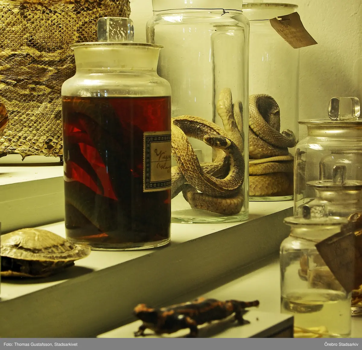 Preparatburkar med huggorm på Biologiska museet, 2014-04-28