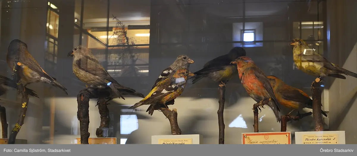 Korsnäbbar i monter på Biologiska museet, 2014-04-28