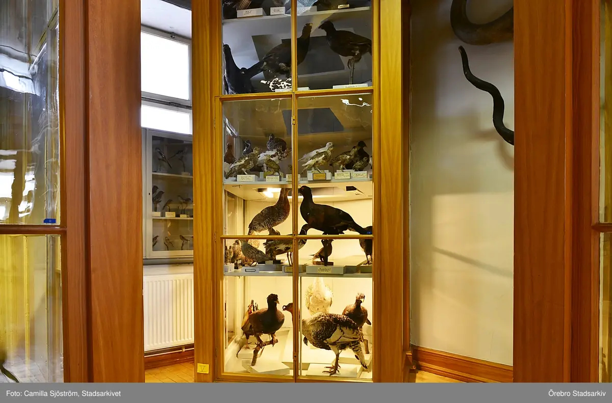 Uppstoppade hönsfåglar i monter på Biologiska museet, 2014-04-28