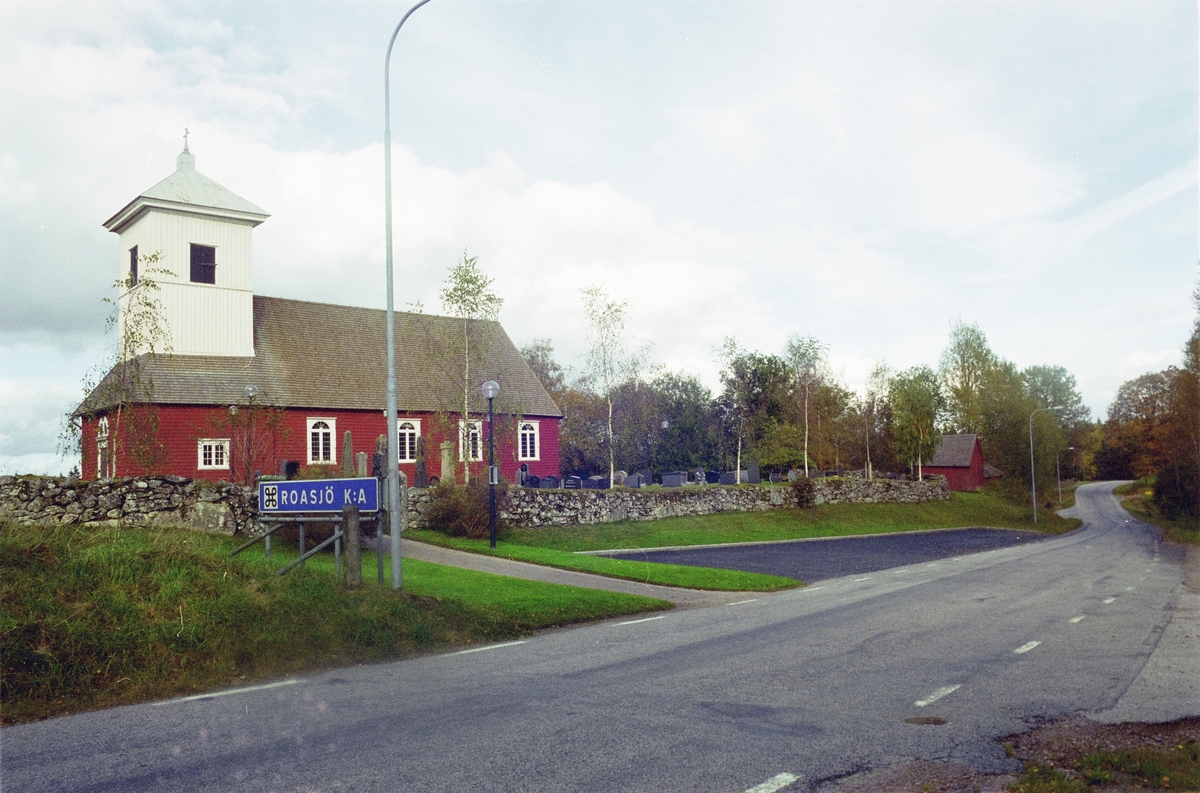 Kyrkan med kyrkogårdsmur och väg, från SV Roasjö