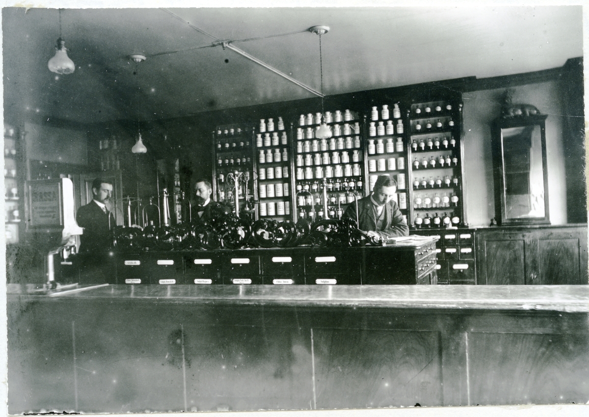 Titel: Västerås, Stora gatan 29. Interiör av Apoteket Hjorten, c:a 1900.