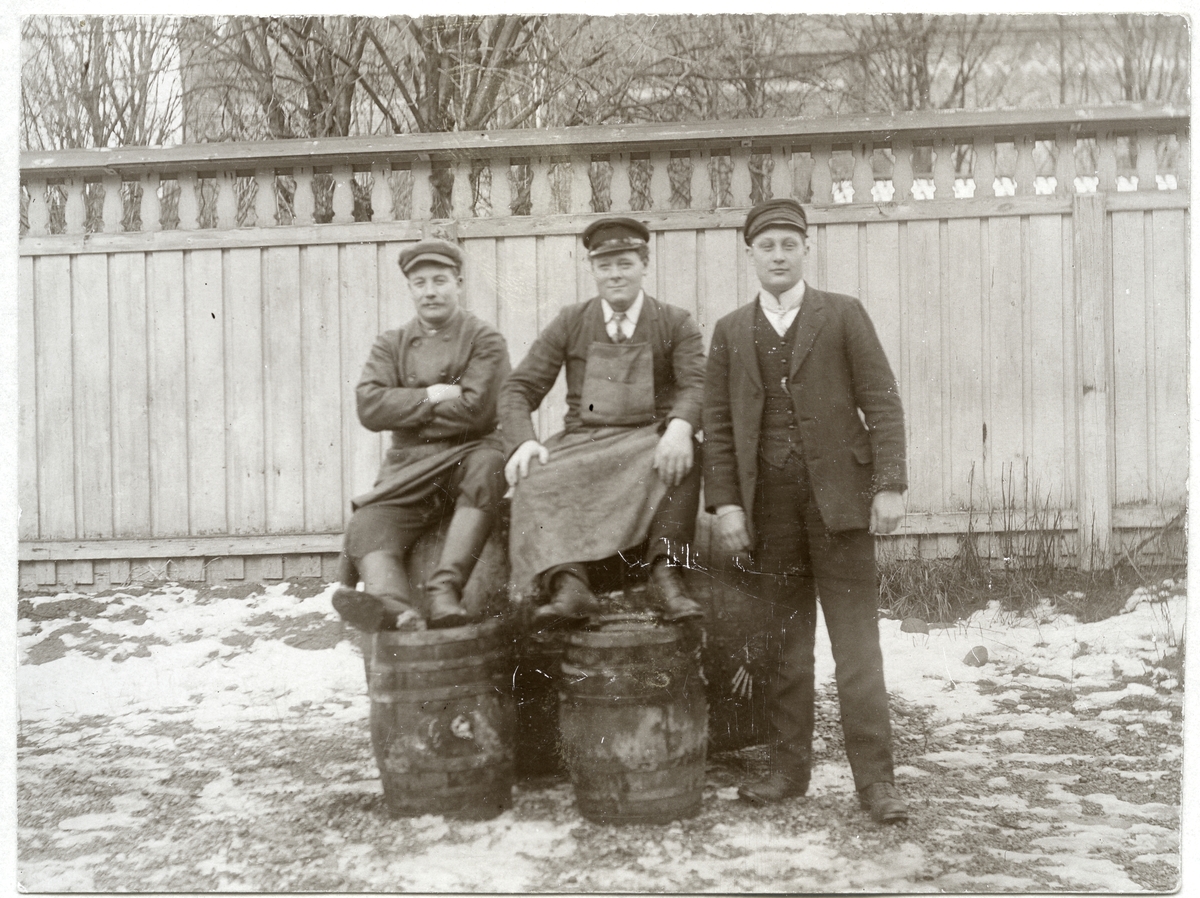 Tre män på tomten utanför Systembolaget vid Stadshotellet. 1900-1910-tal.