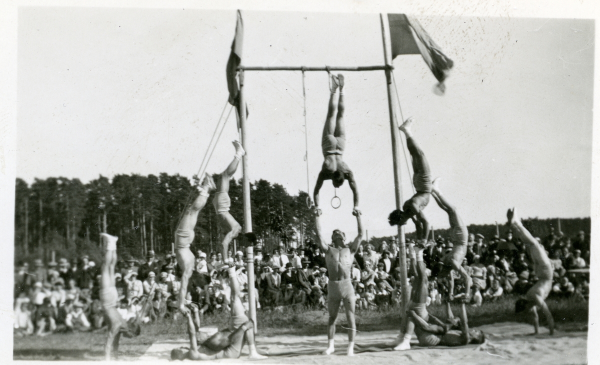 Arostruppen i gymnastisk uppvisning på Vallby, 1940-tal.
