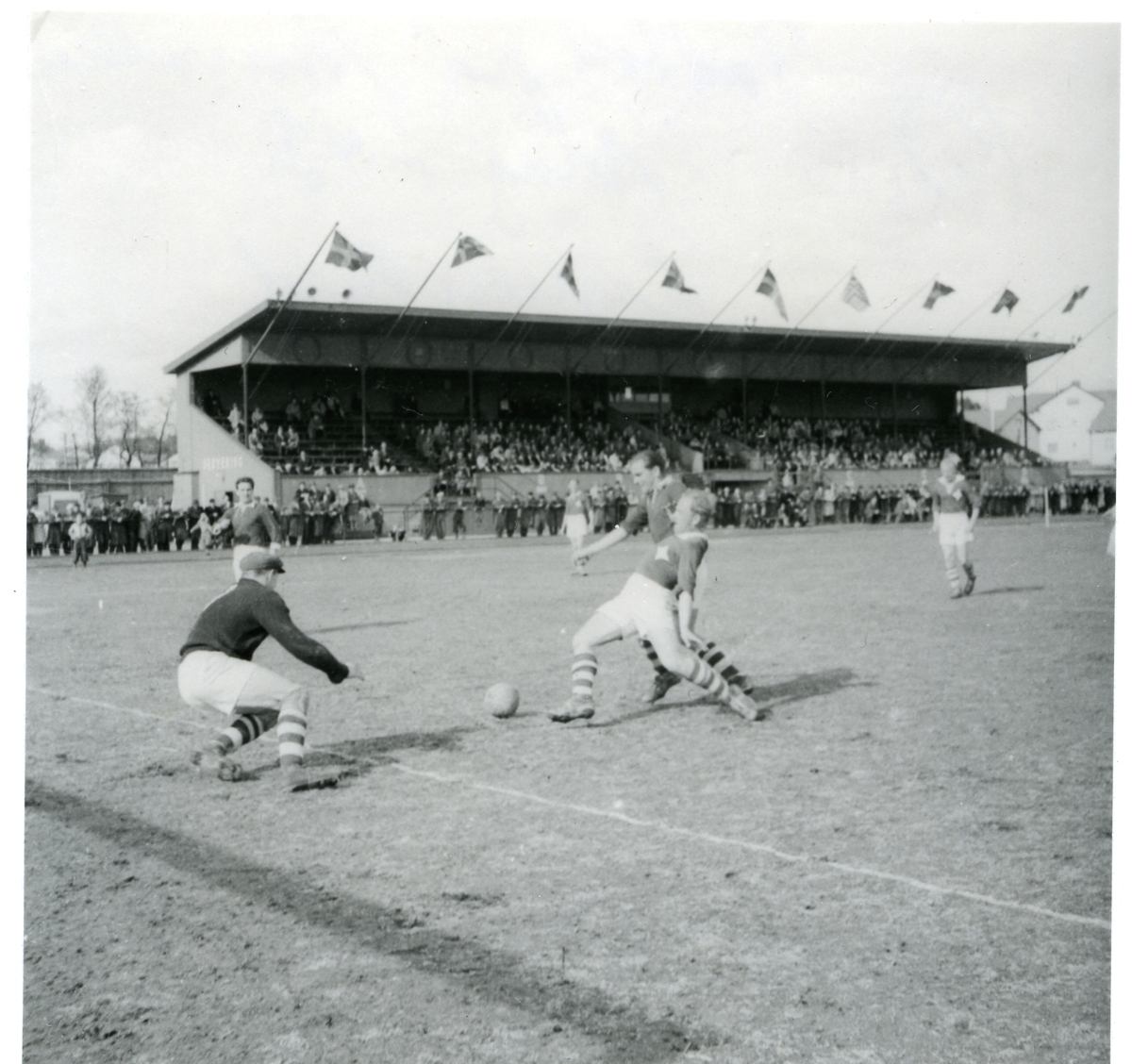 Fotbollsmatch mellan IFK och okänt lag på Arosvallen, 1947.