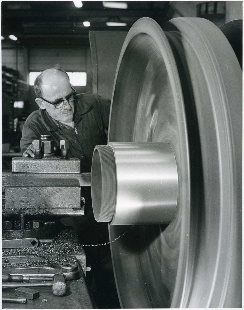 Sjölanders Mekaniska Verkstad. Äldre man vid svarv. 1950-talet.