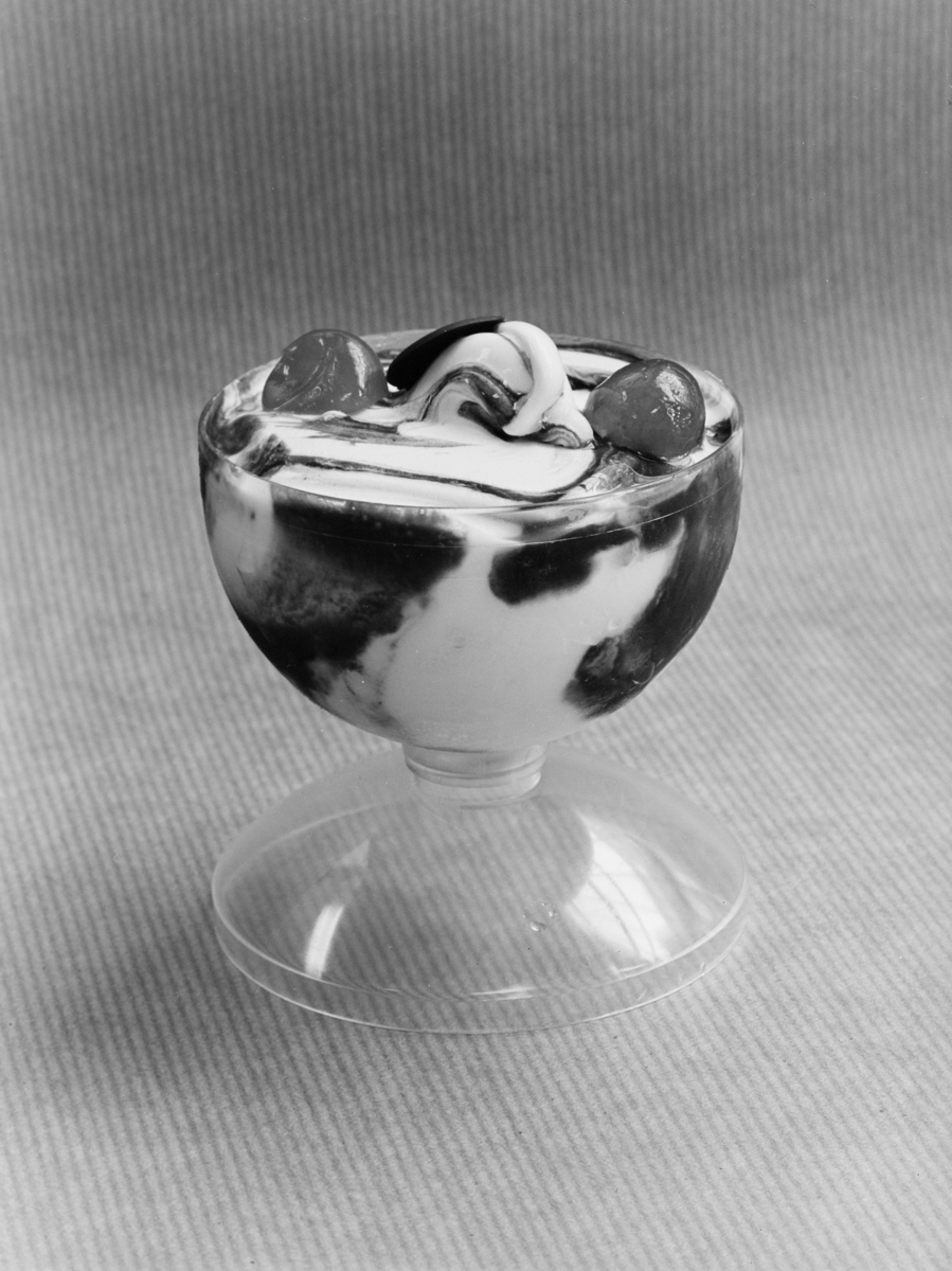 Titel: Glace-Bolaget, plastcup med garnering, stängd och öppnad, interiör Vips glassbar
