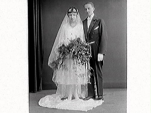 Tre bröllopsbilder med makarna Alling. Bruden har en lång slöja och myrtenkrona formad som en hjälm.