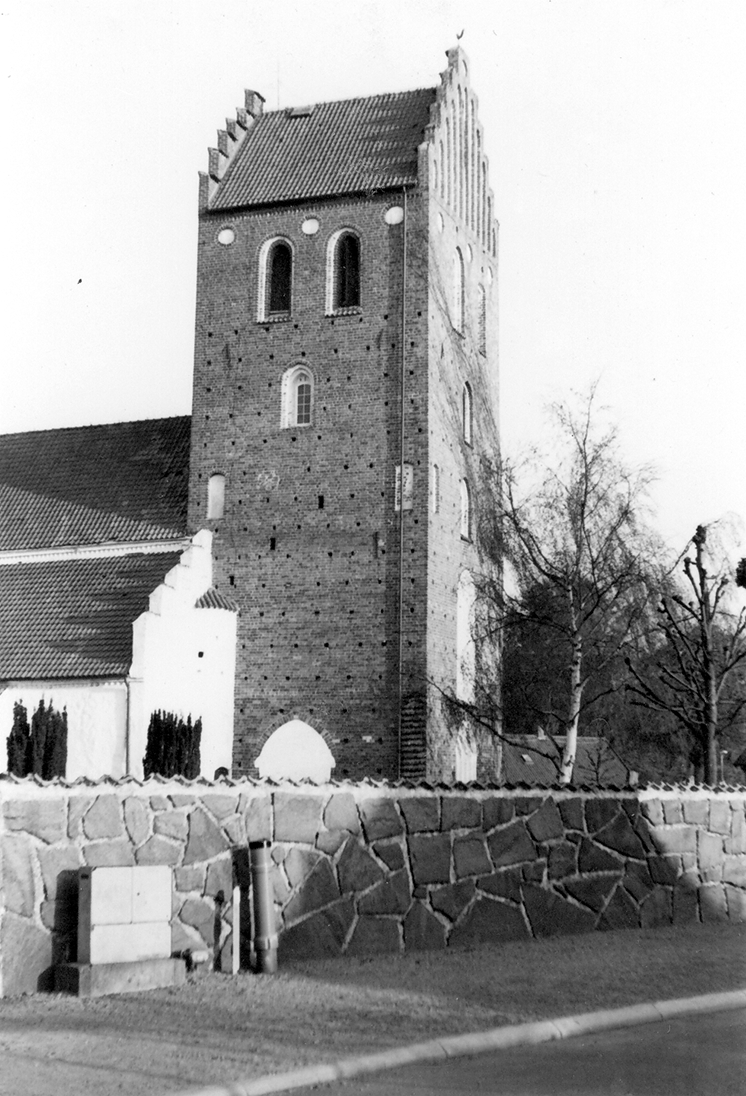 Båstad kyrka med kyrkogårdsmuren i förgrunden. Kyrkan är uppförd av tegel under 1400-talets förra hälft.