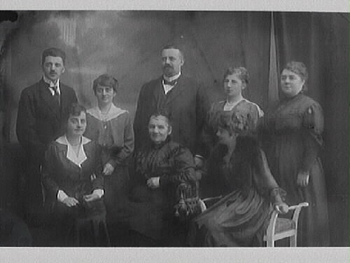 Familjebild av åtta vuxna personer, beställd av Dahlberg.