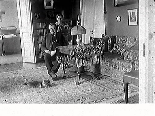 Interiör av salongen hos skohandlare David Larsson med fru Hilma Larsson. Framför dem ligger en katt på den orientaliska mattan.