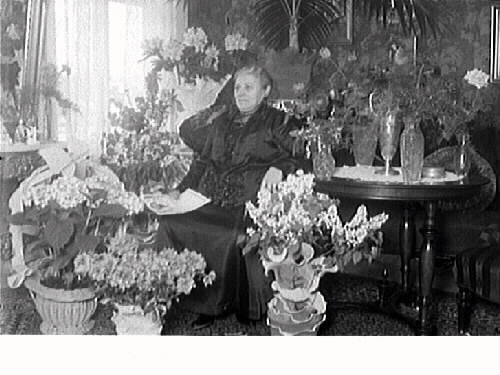 Fru Andersson fotograferad i hemmet, sannolikt firande sin födelsedag då hon är omgiven av blomsteruppsättningar och buketter.
