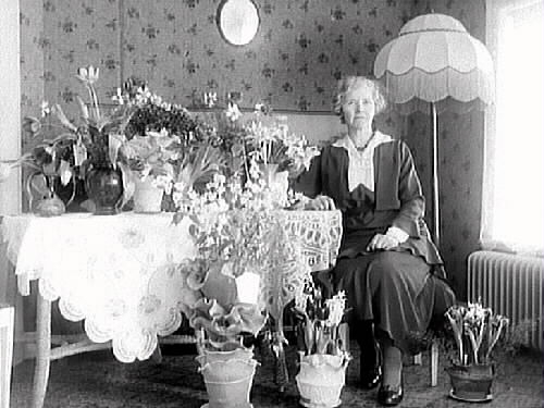 Fröken Apell sittande vid sina gratulationsblomster med bl a narcisser och tulpaner. Födelsedagsfirande.