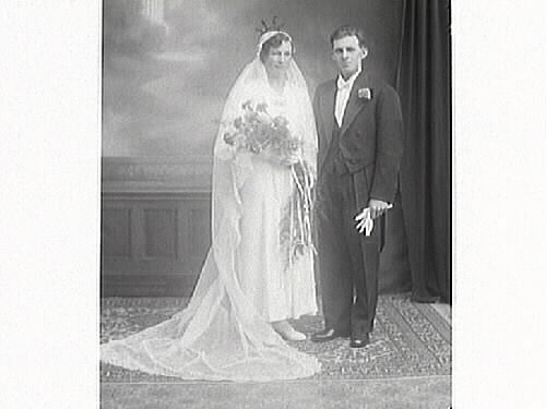 Brudpar, Allan Andersson från Hunnestad Blixtorp med maka. Bröllopsbild. (Se även bildnr MR2_296, MR2_298, MR2_299)