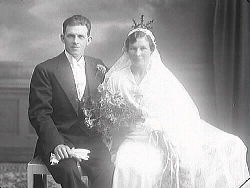 Brudpar, Allan Andersson från Hunnestad Blixtorp med maka. Bröllopsbild. (Se även bildnr MR2_296, MR2_297, MR2_298)
