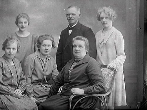 Familjebild. Kommunalarbetare Amandus Jönsson med fru och fyra döttrar. Kv Nålmakaren 9, Norrgatan 42, Varberg.