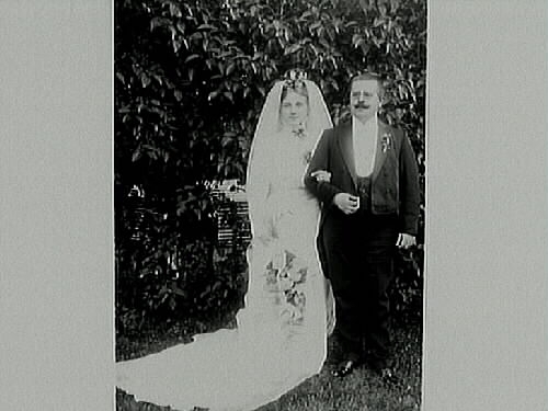 Brudpar fotograferade utomhus vid ett buskage. Bröllopsbild beställd av Chrona i Göteborg.