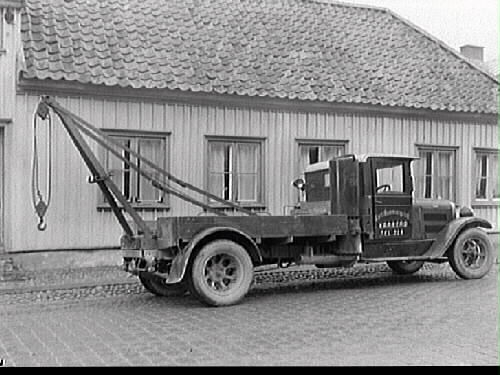 Bärgningsbil står utanför Hammarqvists bilverkstad som låg utmed Borgmästaregatan, kv Nålmakaren. (Se även bildnr GB2_3676, GB2_3677)