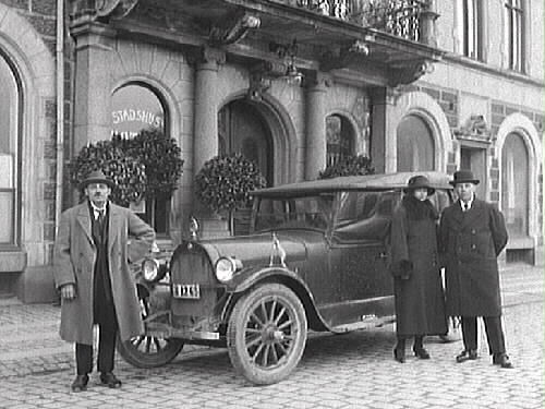 Personbil samt en kvinna och två män framför entrén till Varbergs stadshus på Kungsgatan i Varberg (även Stadshotellet).
