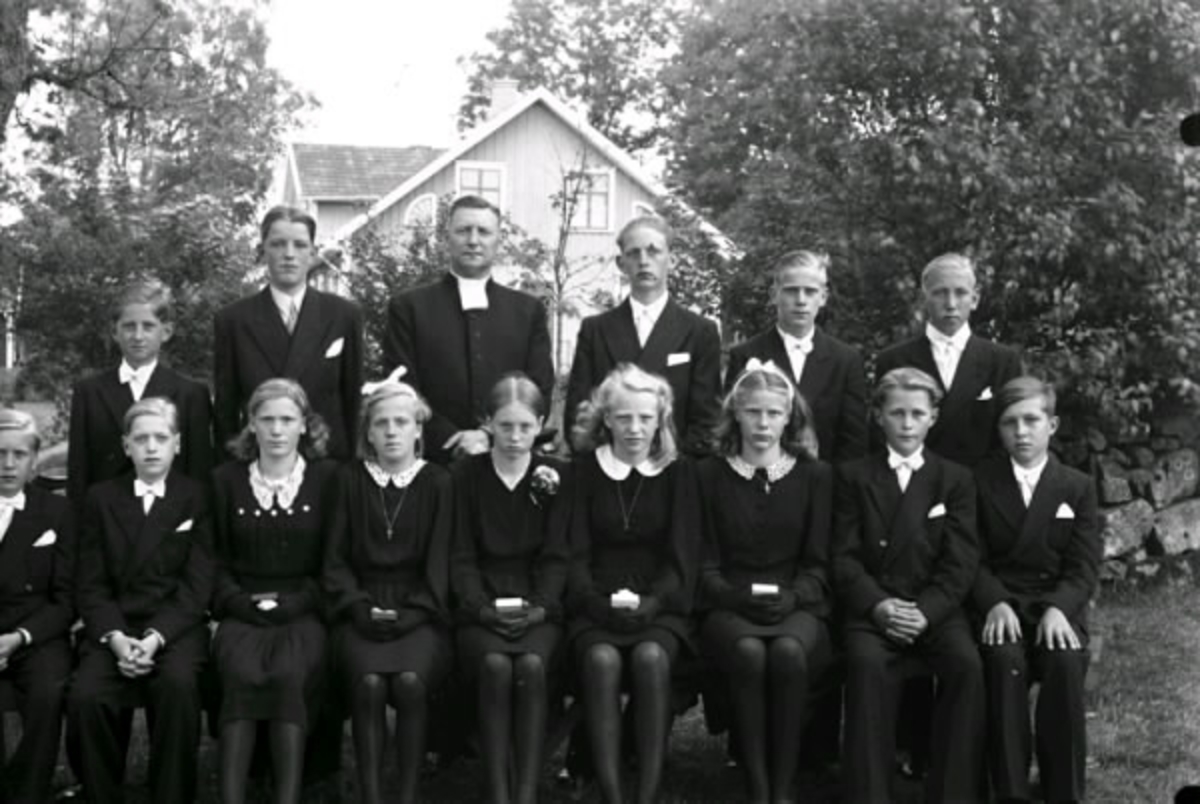 Präst. Konfirmation i Drängsered 1946. Samtliga konfirmander födda 1932. Rolf Eriksson, Ella i Hylte, Robert i Frillebo, Helmer i Älmö, Asta Grimberg, Inger i Elgåsfors, Rolf E, Arne i Kila