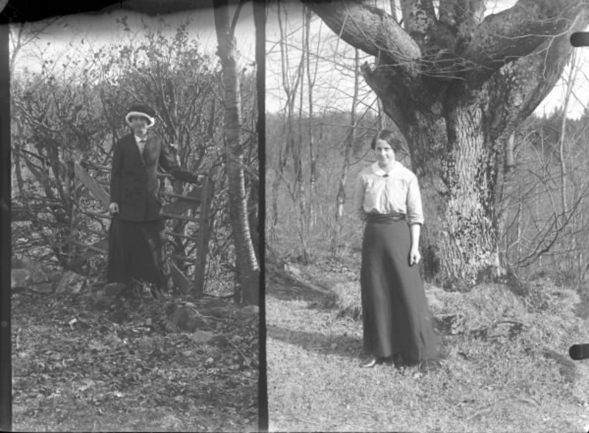 Kvinnoporträtt. Står vid träd. Dubbebild.