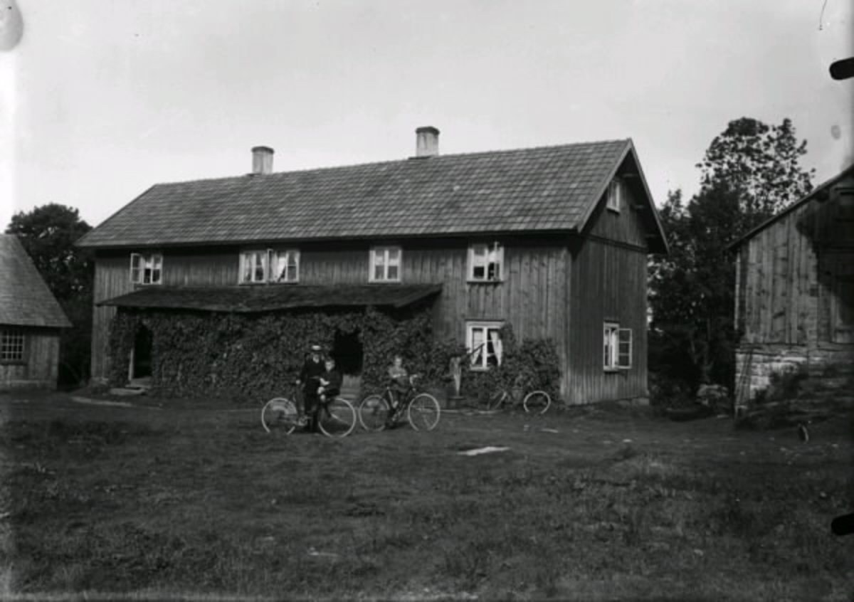 Lantgård i Viserhult, Färgsryd socken. Mangårdsbyggnaden har två skorstenar och två ingångar. Den gamla byggnaden till höger kallades Lilla Höbbaret. Framför huset står en man och två pojkar med cyklar. Vid husväggen står en cykel på lut.