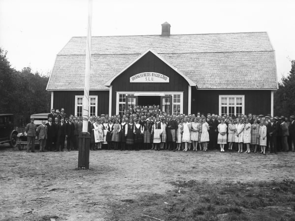 Folksamling framför Drängsereds Bygdegård. Vid husgaveln står ett par bilar.