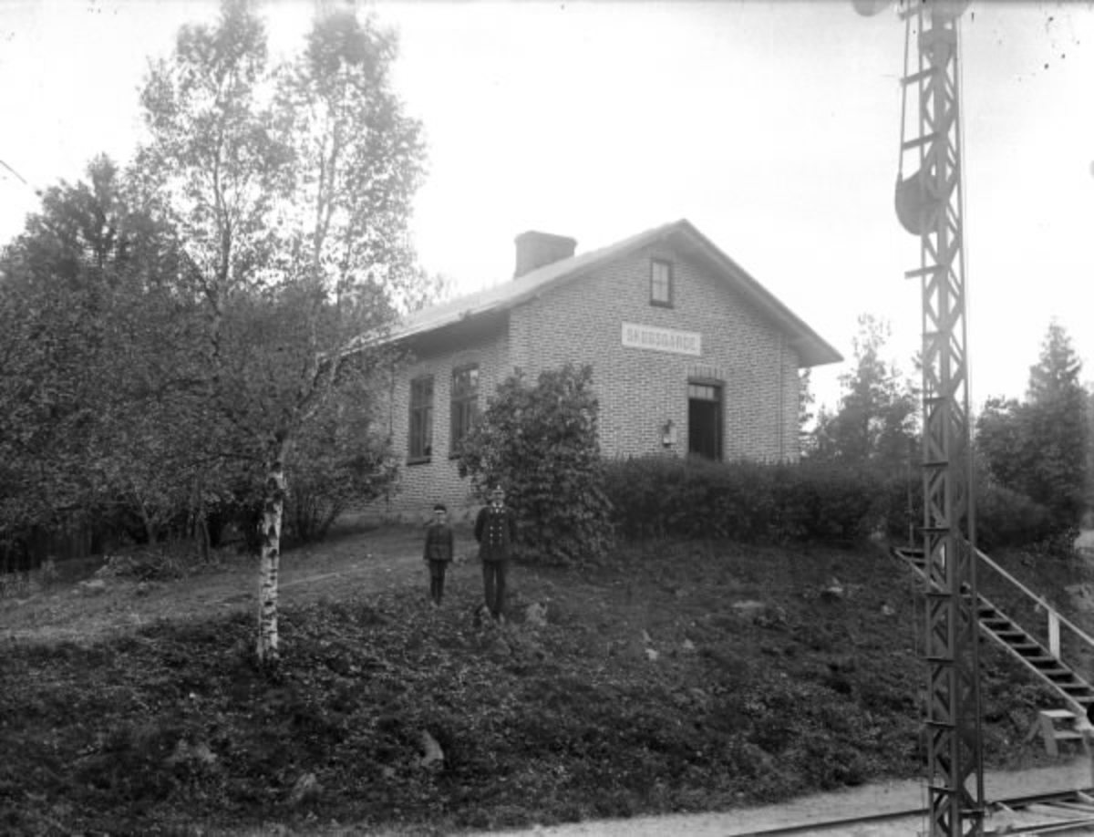 Järnvägsstation i Drängsered, Byggnaden har tegelfasad och en skylt på gaveln. En trätrappa leder ner till banområdet. I slänten står en pojke och en uniformsklädd man.