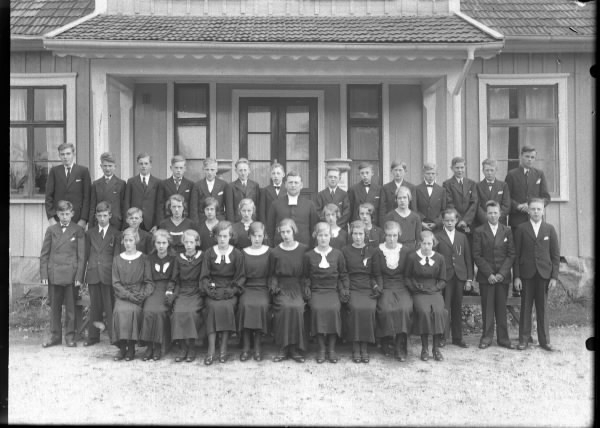 Stor mörkklädd konfirmandgrupp samlad framför en veranda, kanske till prästgården. Prästen står i mitten.