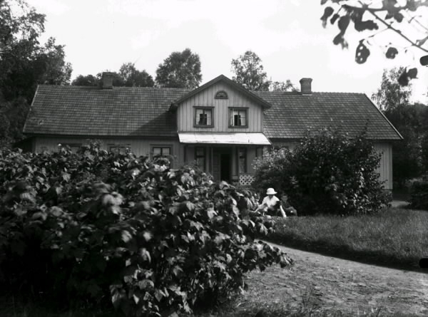 Drängsereds prästgård. Bild 1: Mia Lindeskog sitter vid ett buskage i trädgården med ett österikiskt krigsbarn ca 1920. Bild 2: Prästgården sedd från andra hållet med en plöjd åker i förgrunden.