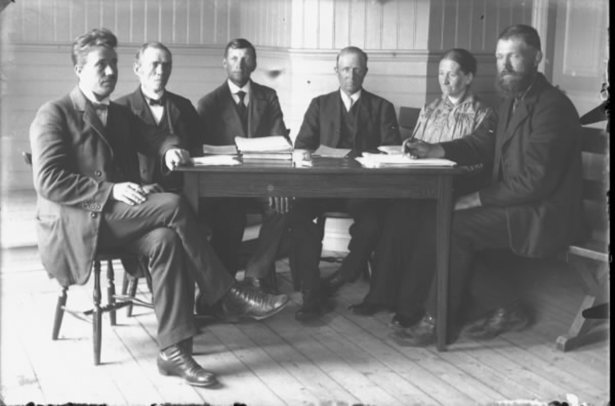 Sex personer har möte i en offentlig lokal; en kvinna och fem män.