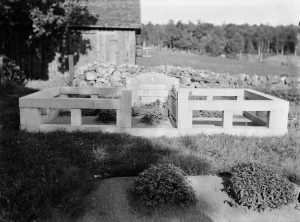 En mycket speciell gravvård med en kraftig inhägnad, försedd med en smidd grind som står öppen. Nära inpå ligger ett uthus. I förgrunden ses en annan krattad grav.