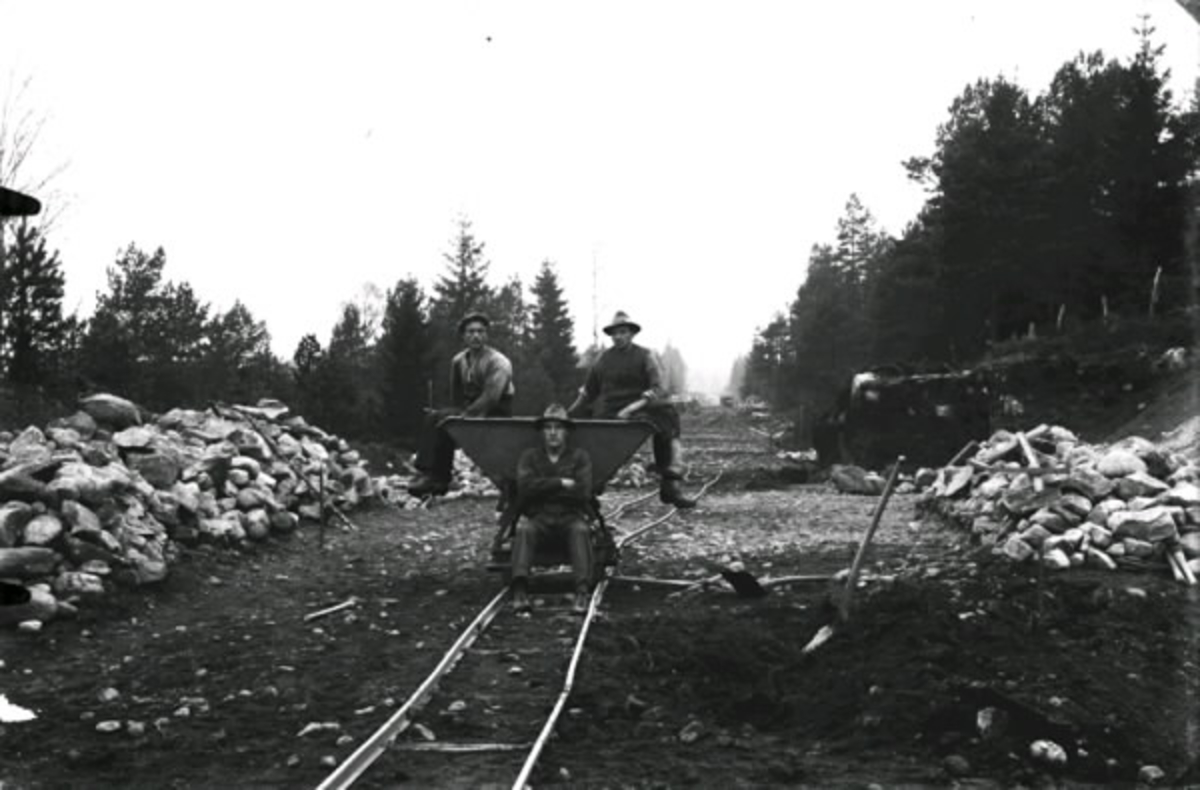 Tre män, vägarbetare, vid en vagn som går på räls.