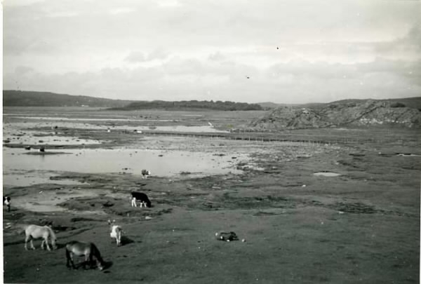 Betande kor och hästar på strandängarna innanför Möaskär, Örmevalla, mot nordost.