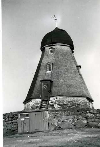 Väderkvarn som förlorat sina vingar. Fasaden är spånklädd och kantig, med indragna ytor där fönster och dörr är placerade. Dörren sitter ovanför den höga stengrunden så en trappa leder upp till ingången. Kvarnen står på ett högre markplan och vid stenskoningen mellan marknivåerna står en liten fösterförsedd bod. En spira pryder det lökformade taket.