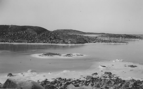 Stubbholmssund med Stubbholmen. Havsvy vintertid med snö och is.
