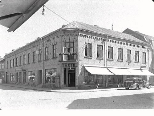 Textilaffär i hörnet Drottninggatan-Norrgatan. Tegelhuset har en kraftig takgesims och en balkong på det avskurna hörnet, över affärsentrén. Markiserna är nedfällda på den soliga sidan och där står en bil parkerad.