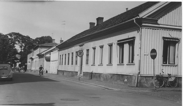 Stadsbebyggelse längs Västergatan i Kungsbacka, sett från hörnet av Norra Torggatan. Flera bilar och en mopedist ses på gatan och en cykel står parkerad mot husgaveln.