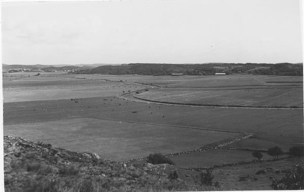 Rolfsåns nedersta lopp i odlingslandskapet ut mot Kungsbackafjorden, sett från norr.