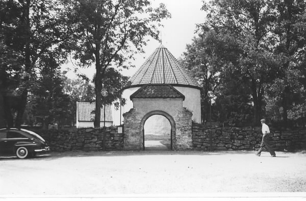 Stigporten in till Hanhals kyrka och kyrkogård. Kyrkans rundade kor ses bakom stigporten. Till vänster står en Volvo PV parkerad och en man kommer gående från höger.