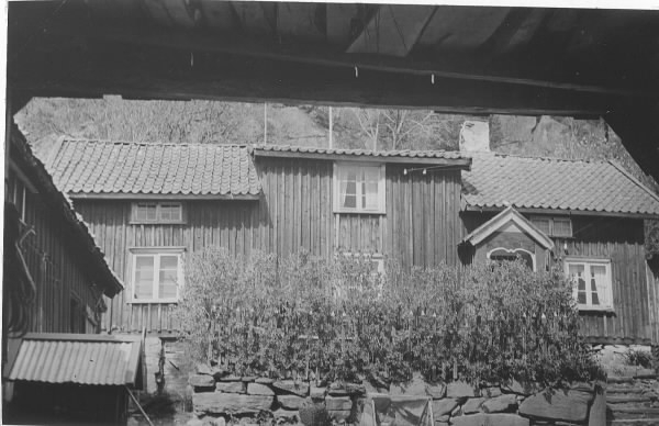 Bostadshuset till en gård i Knipered, sett genom portlidret. Huset ligger på en högre nivå än uthusen och på sättmuren står en rad buskar. Ingången är försedd med en s k skunke; en grund utbyggnad med rundat valv som sedavnligt har väggfasta bänkar längs sidorna.
