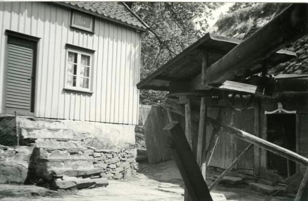 Bondgård i Stråvalla, troligen Skattagården, del av boningshus med hög grund och stentrappa upp till dörren. Till höger en ladugård eller annan ekonomibyggnad med någon anordning i förgrunden, sannolikt en vandring.