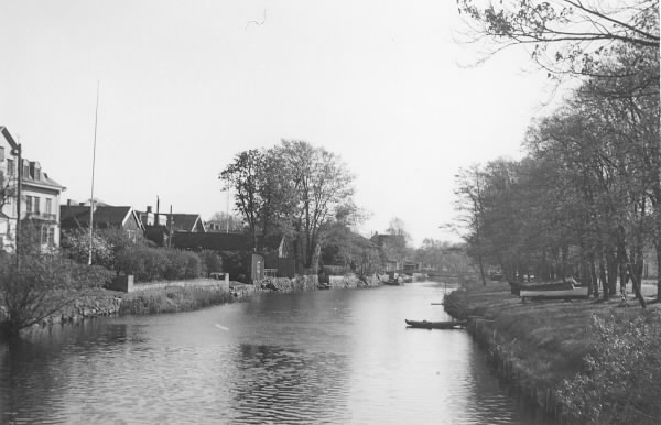 Vy längs Kungsbackaån sett från bron, med stadsbebyggelsen längs vänstra sidan och Sjöallén till höger om vattendraget.