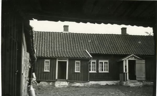 Gård i Vallda kyrkby, väster om säteriet. Vy genom portlidret mot bostadshuset, som har två ingångar med olika stora farstur. Några mjölkkannor står mot fasaden till vänster.