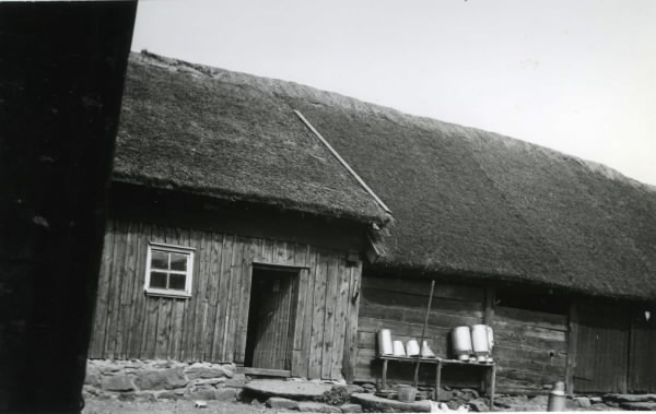 Gammal ladugård med halmtak och mjölkkannor på tork längs väggen av skiftesverk. Kockagården, Källstorp 3:7 i Värö.