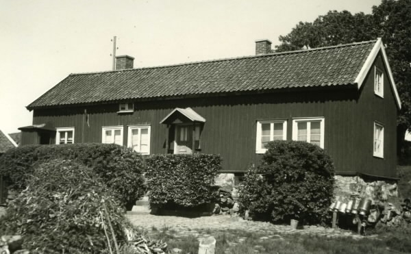 Bostadshuset på Välås nr 5 i Vallda socken. Framför huset står flera figurklippta buskar och till höger står flera mjölkkannor på tork.