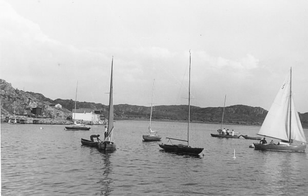 Olika typer av segelbåtar på vattnet i Sörvik, Särö. Bergen kantar havsviken och till vänster ses bryggor och några bodar.