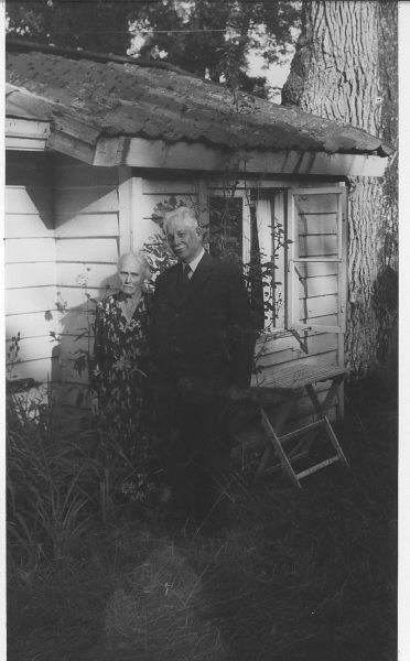 Porträtt av paret Gudrun och Axel Romdahl utanför en stuga på gården Ekeliden, Särö.